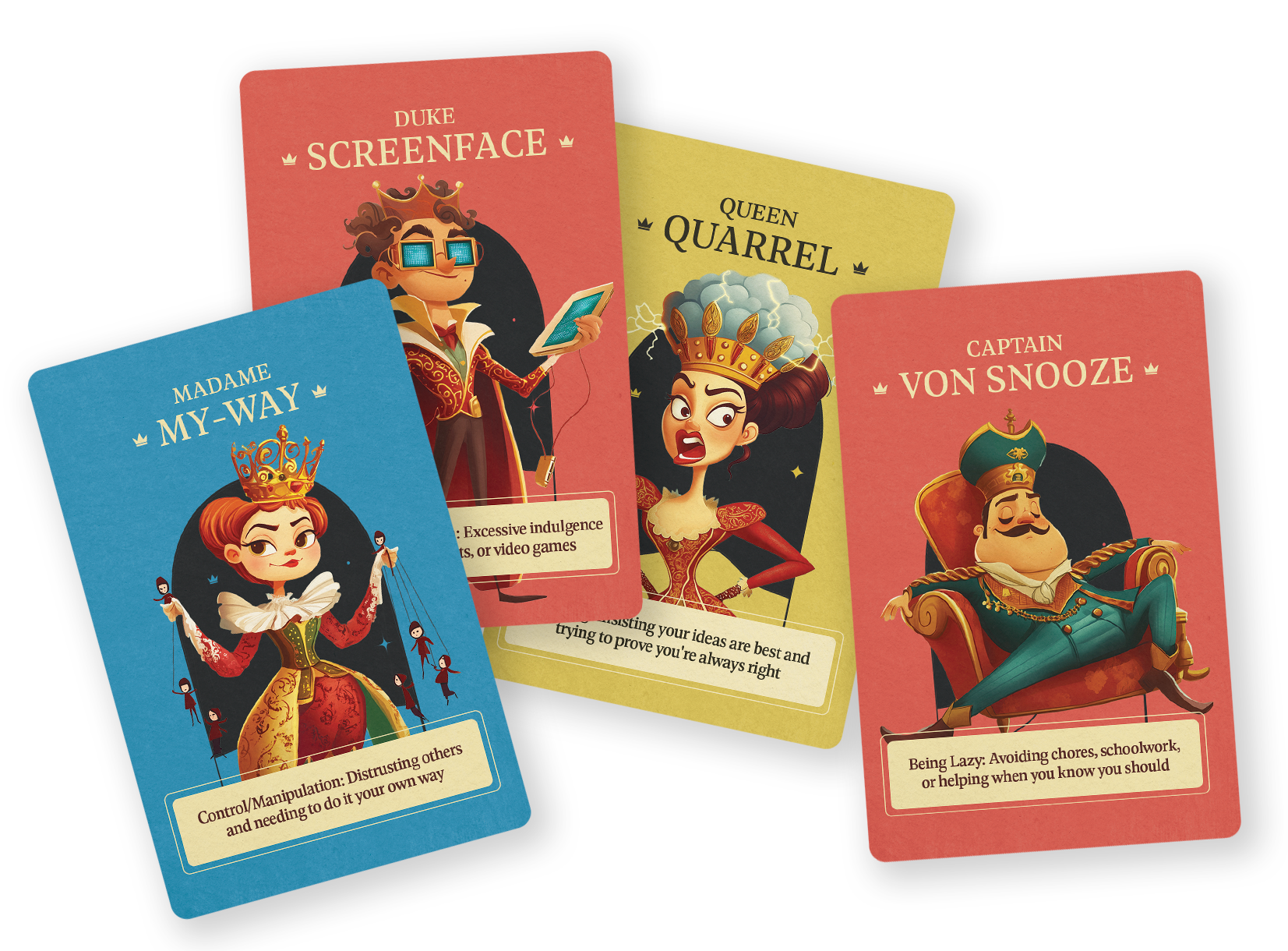 Playful “villains” that represent the ways of the world without getting heavy or shamey. Each one has a silly title and a clear takeaway that sparks honest reflection.